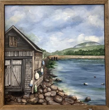An old wooden boat, up on stilts is lit in late fall crisp light with bright orang